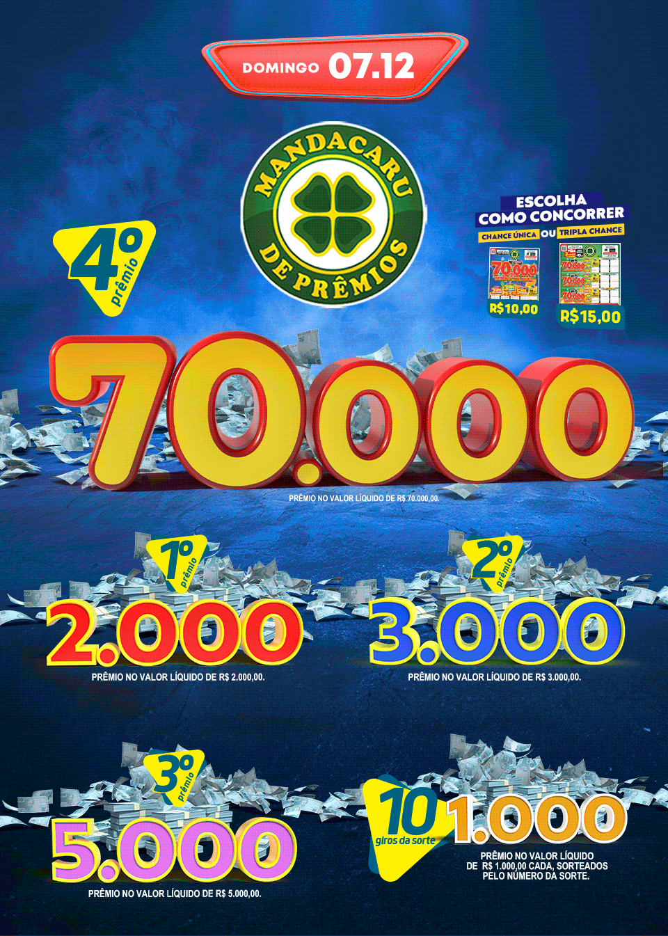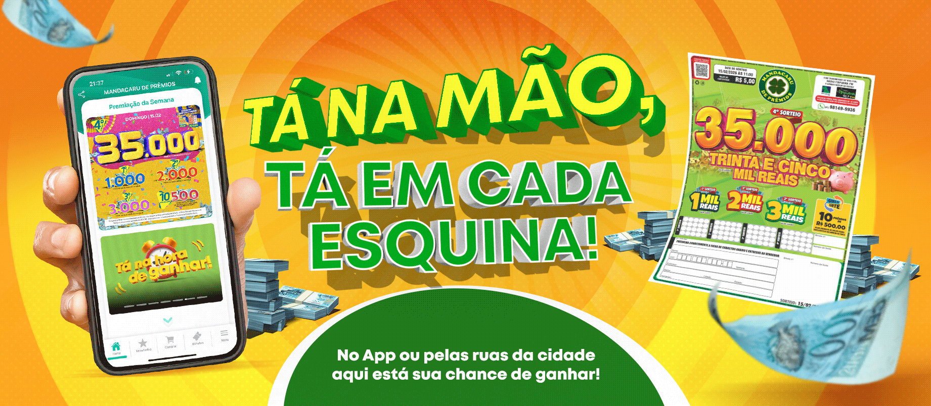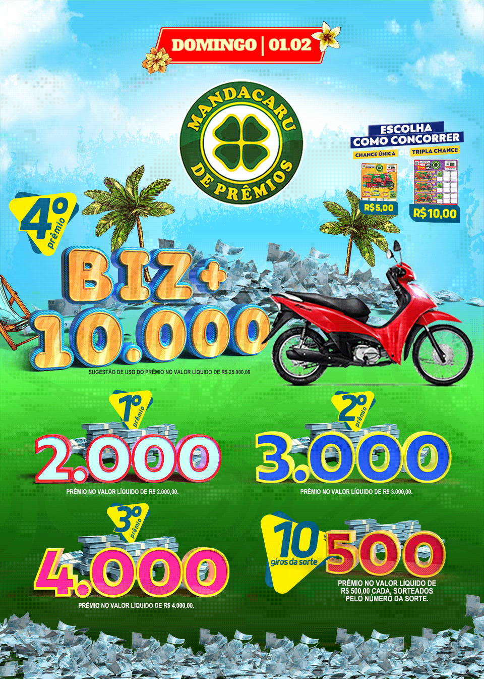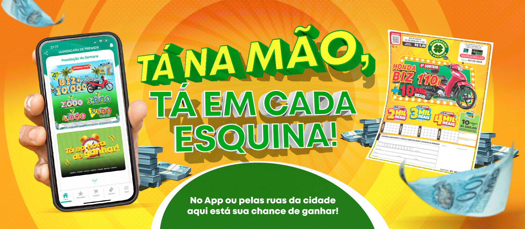 Ao adquirir o Mandacaru de Prêmios, você concorre a valiosos prêmios semanalmente. Os bens oferecidos como prêmios são meramente ilustrativos. O Mandacaru de Prêmios, é uma promoção aprovada pela SEAE/ME - através do número do processo indicado no seu Mandacaru, conforme dispositivo na Lei Federal 5.768/1971. Antes de contratar, consulte previamente o Regulamento/Condições Gerais.