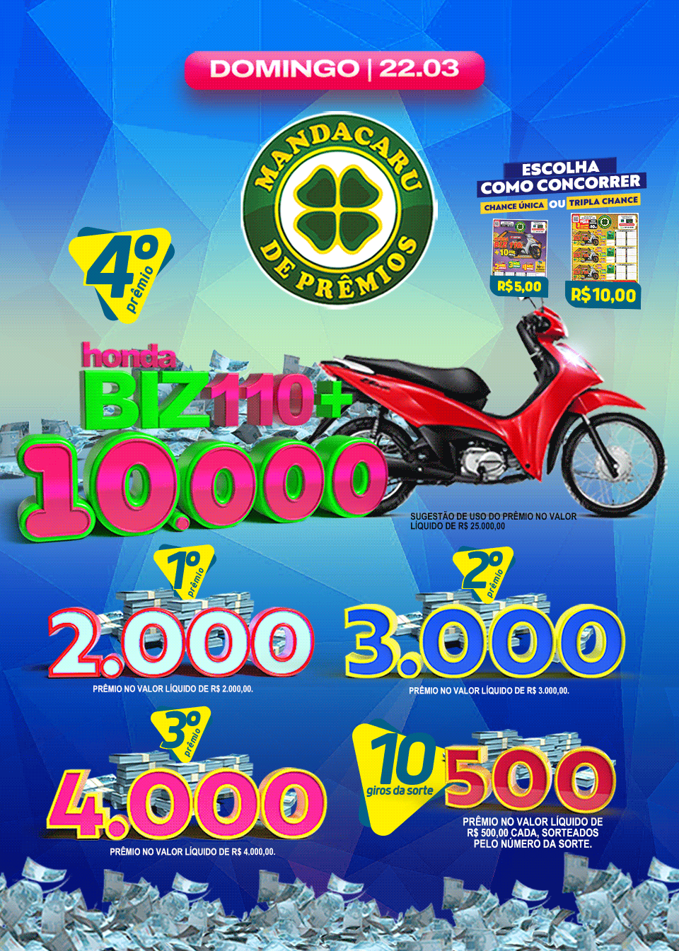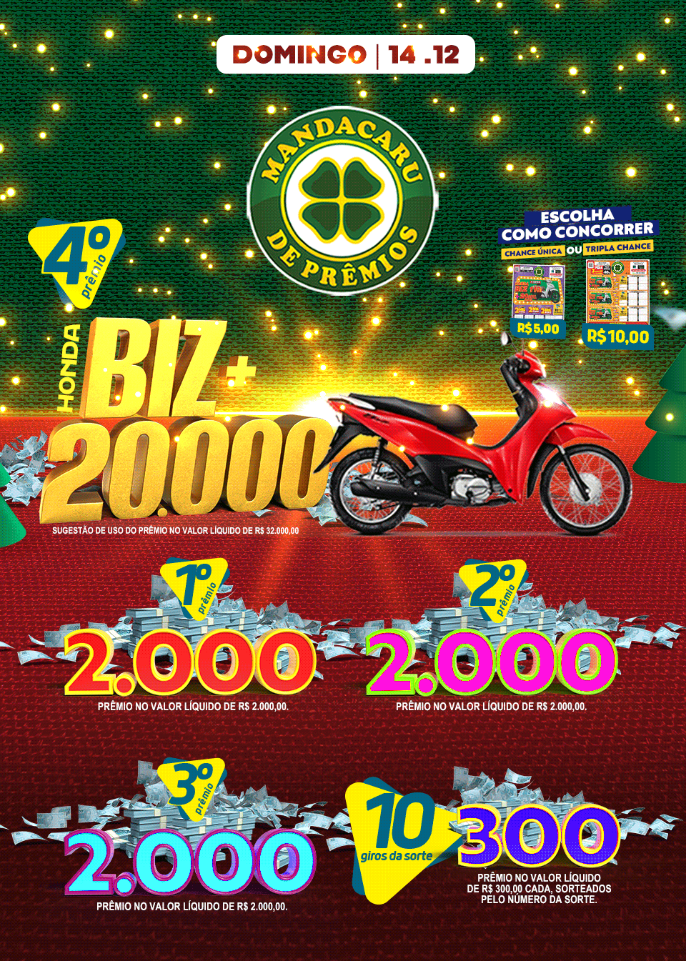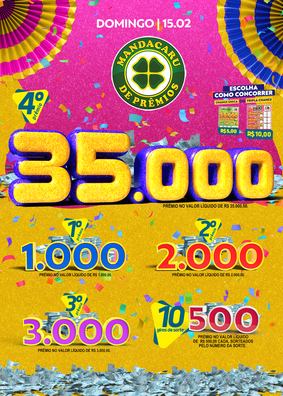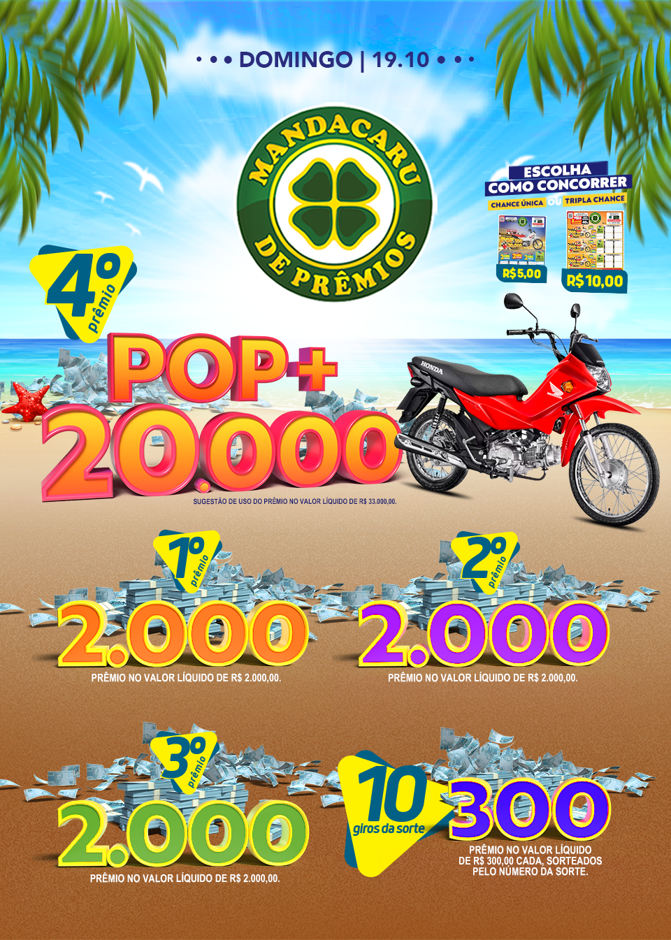 Ao adquirir o Mandacaru de Prêmios, você concorre a valiosos prêmios semanalmente. Os bens oferecidos como prêmios são meramente ilustrativos. O Mandacaru de Prêmios, é uma promoção aprovada pela SEAE/ME - através do número do processo indicado no seu Mandacaru, conforme dispositivo na Lei Federal 5.768/1971. Antes de contratar, consulte previamente o Regulamento/Condições Gerais.