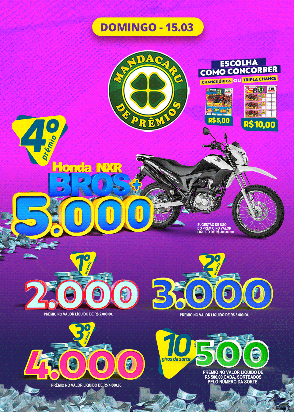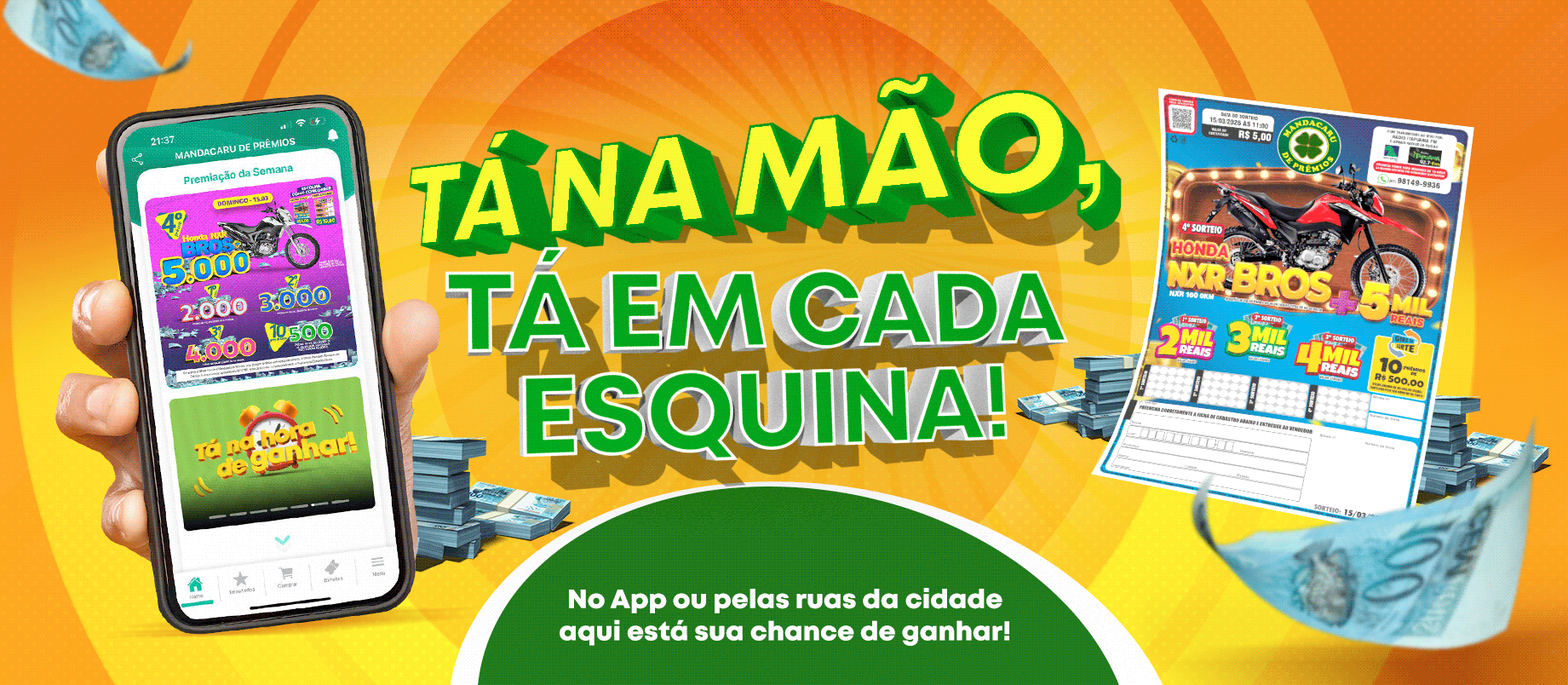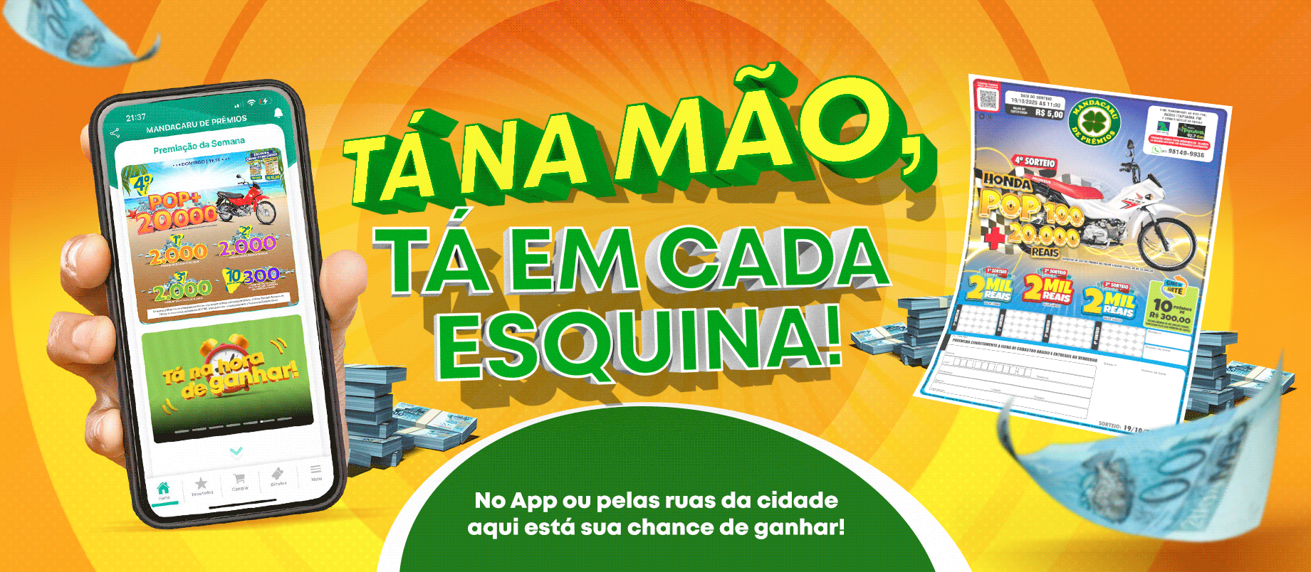 Ao adquirir o Mandacaru de Prêmios, você concorre a valiosos prêmios semanalmente. Os bens oferecidos como prêmios são meramente ilustrativos. O Mandacaru de Prêmios, é uma promoção aprovada pela SEAE/ME - através do número do processo indicado no seu Mandacaru, conforme dispositivo na Lei Federal 5.768/1971. Antes de contratar, consulte previamente o Regulamento/Condições Gerais.