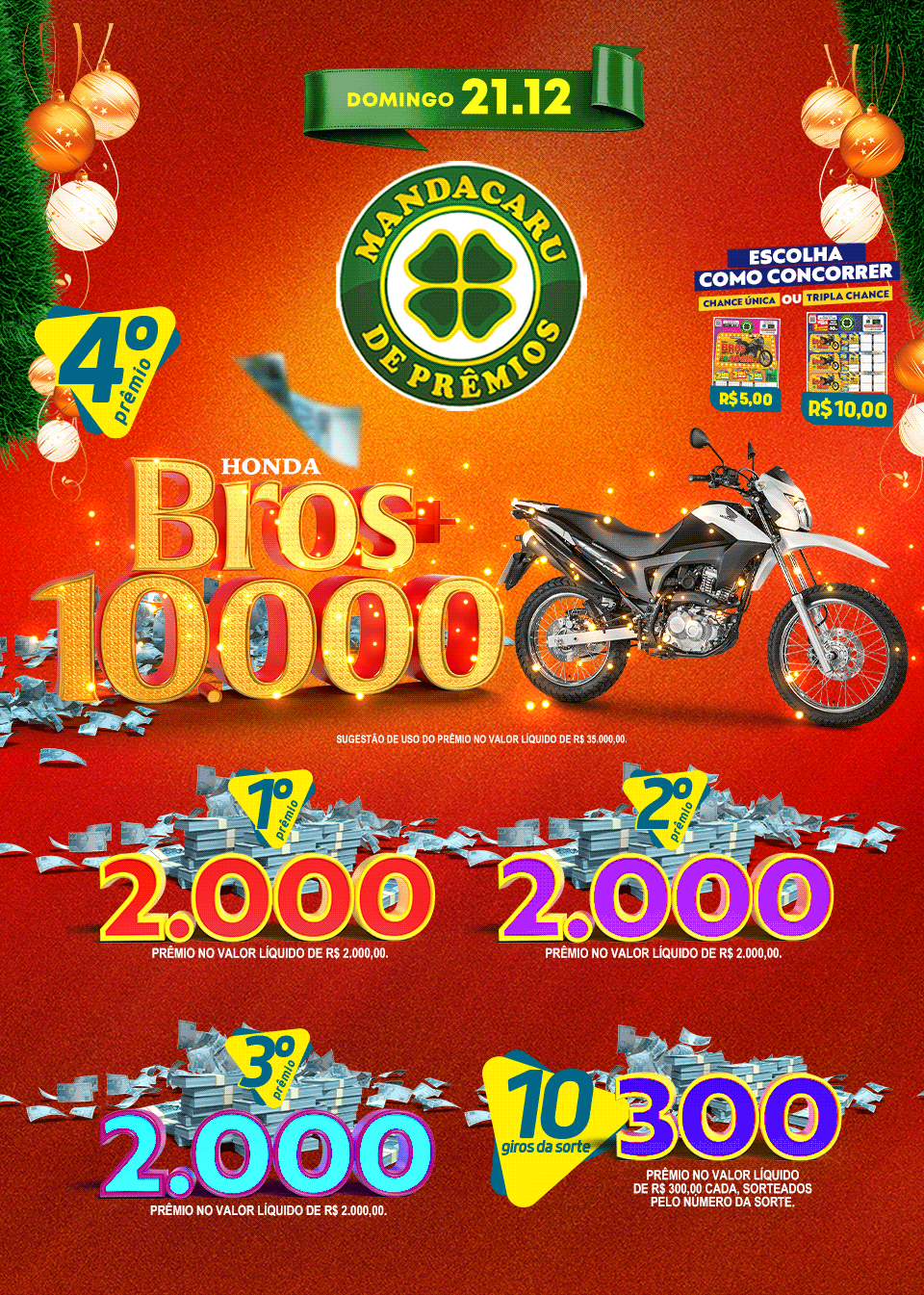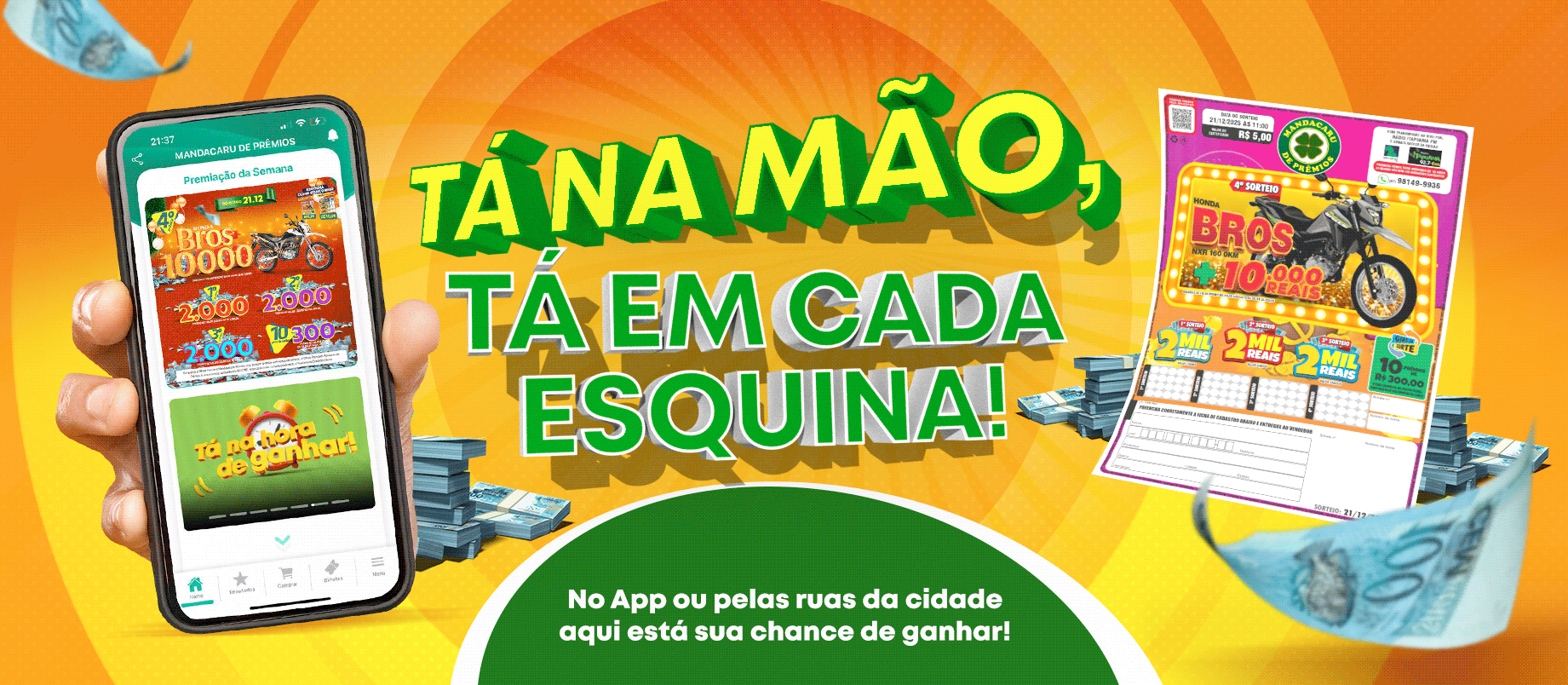 Ao adquirir o Mandacaru de Prêmios, você concorre a valiosos prêmios semanalmente. Os bens oferecidos como prêmios são meramente ilustrativos. O Mandacaru de Prêmios, é uma promoção aprovada pela SEAE/ME - através do número do processo indicado no seu Mandacaru, conforme dispositivo na Lei Federal 5.768/1971. Antes de contratar, consulte previamente o Regulamento/Condições Gerais.