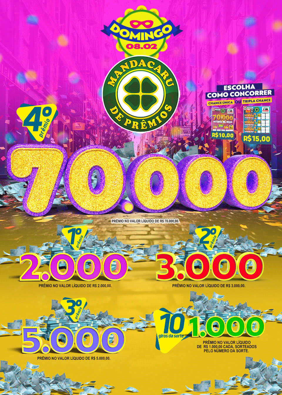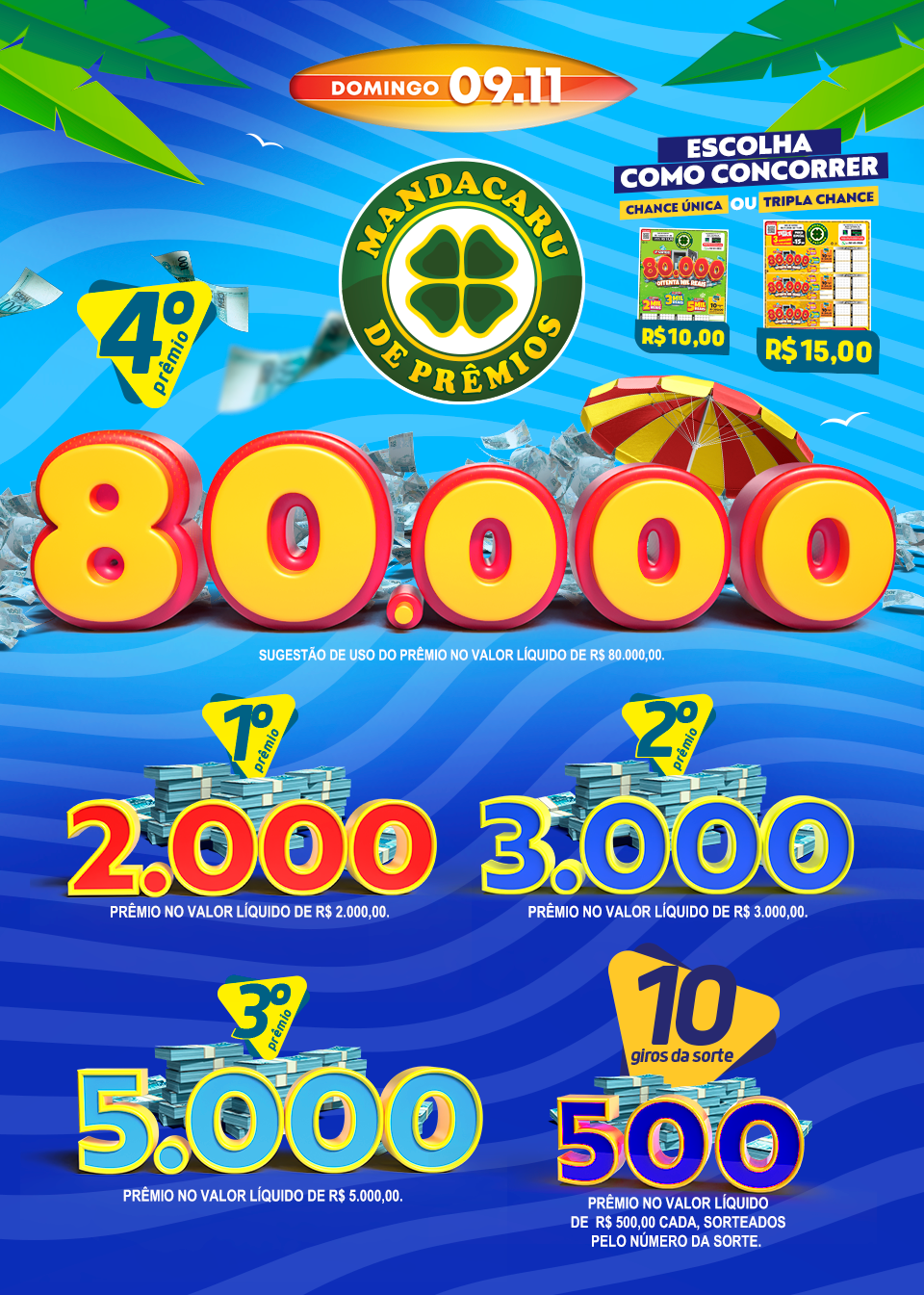 Ao adquirir o Mandacaru de Prêmios, você concorre a valiosos prêmios semanalmente. Os bens oferecidos como prêmios são meramente ilustrativos. O Mandacaru de Prêmios, é uma promoção aprovada pela SEAE/ME - através do número do processo indicado no seu Mandacaru, conforme dispositivo na Lei Federal 5.768/1971. Antes de contratar, consulte previamente o Regulamento/Condições Gerais.