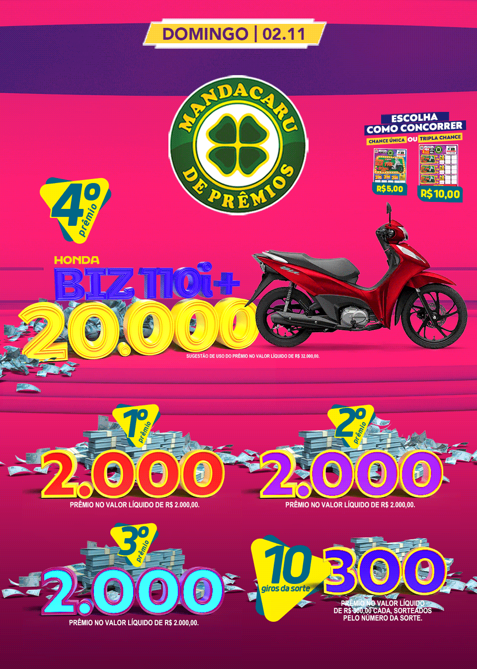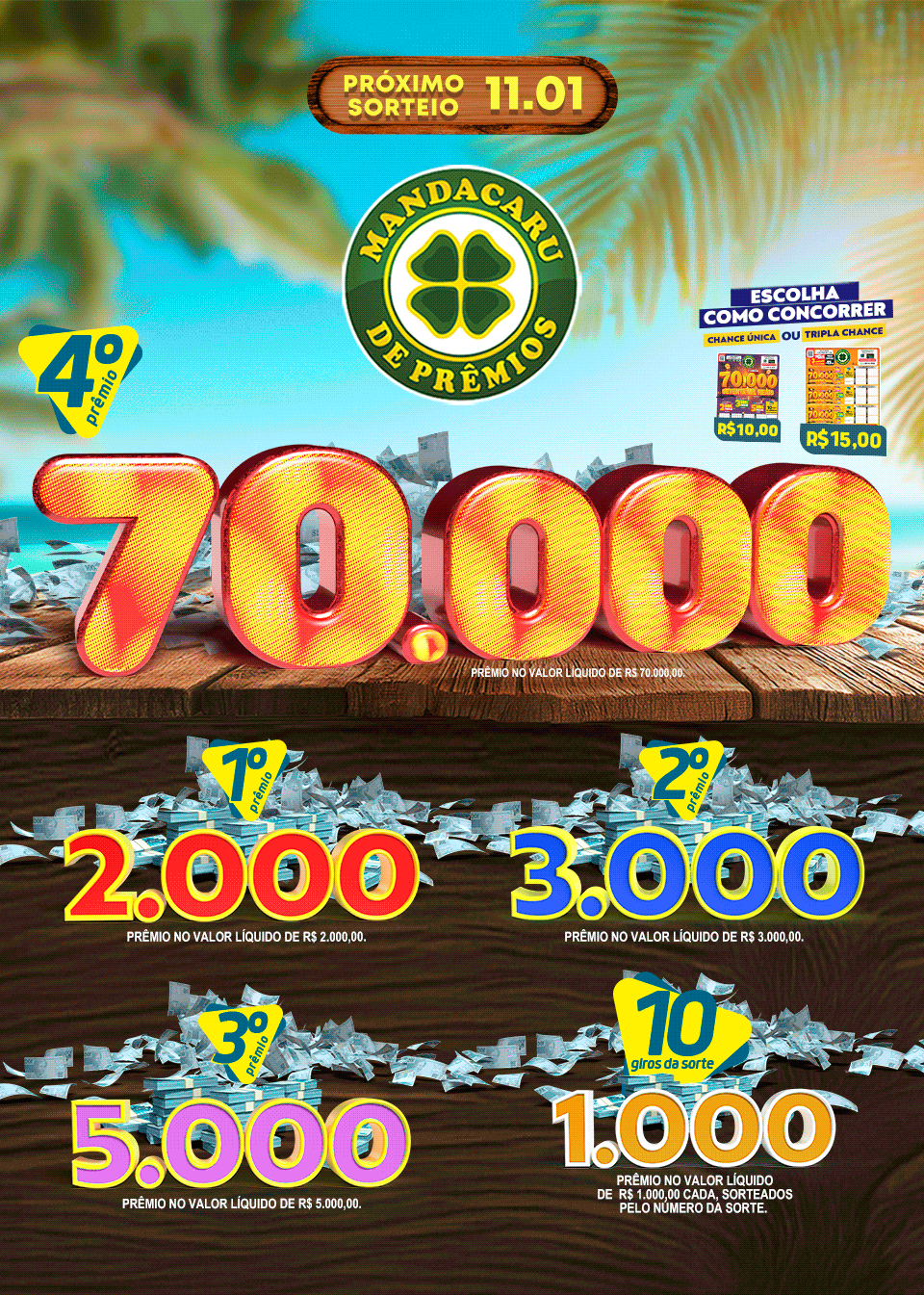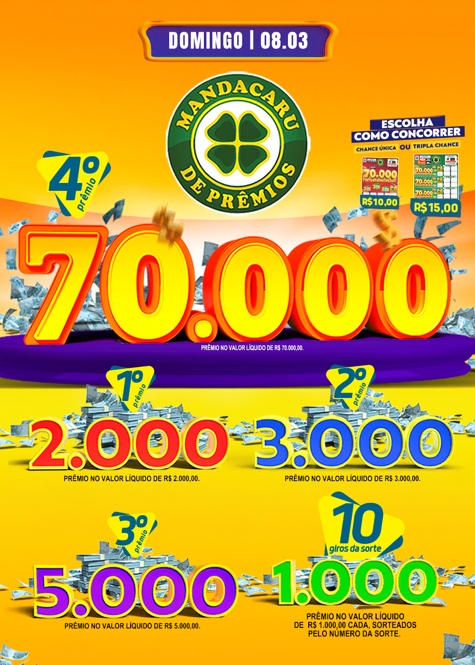 Ao adquirir o Mandacaru de Prêmios, você concorre a valiosos prêmios semanalmente. Os bens oferecidos como prêmios são meramente ilustrativos. O Mandacaru de Prêmios, é uma promoção aprovada pela SEAE/ME - através do número do processo indicado no seu Mandacaru, conforme dispositivo na Lei Federal 5.768/1971. Antes de contratar, consulte previamente o Regulamento/Condições Gerais.